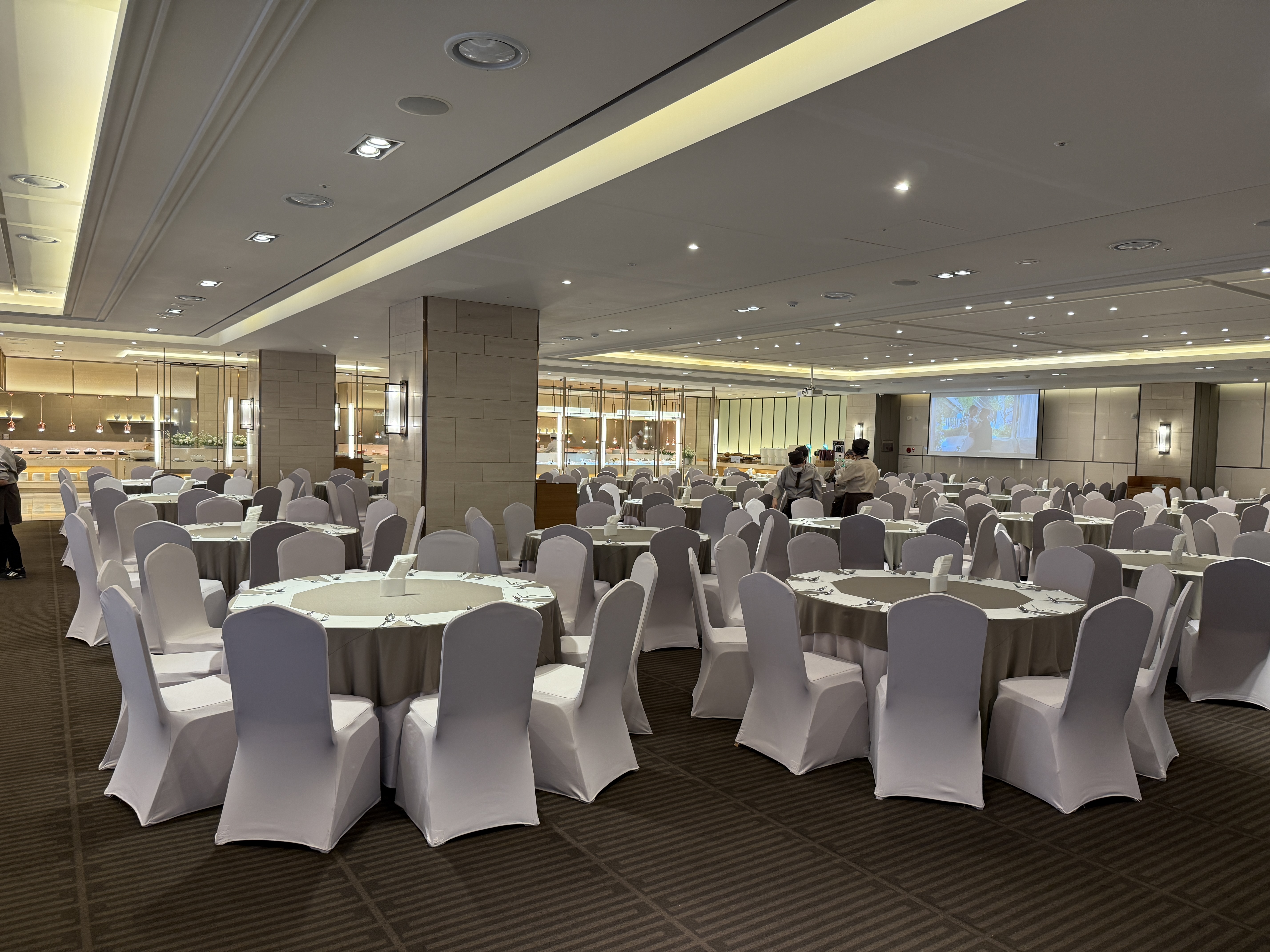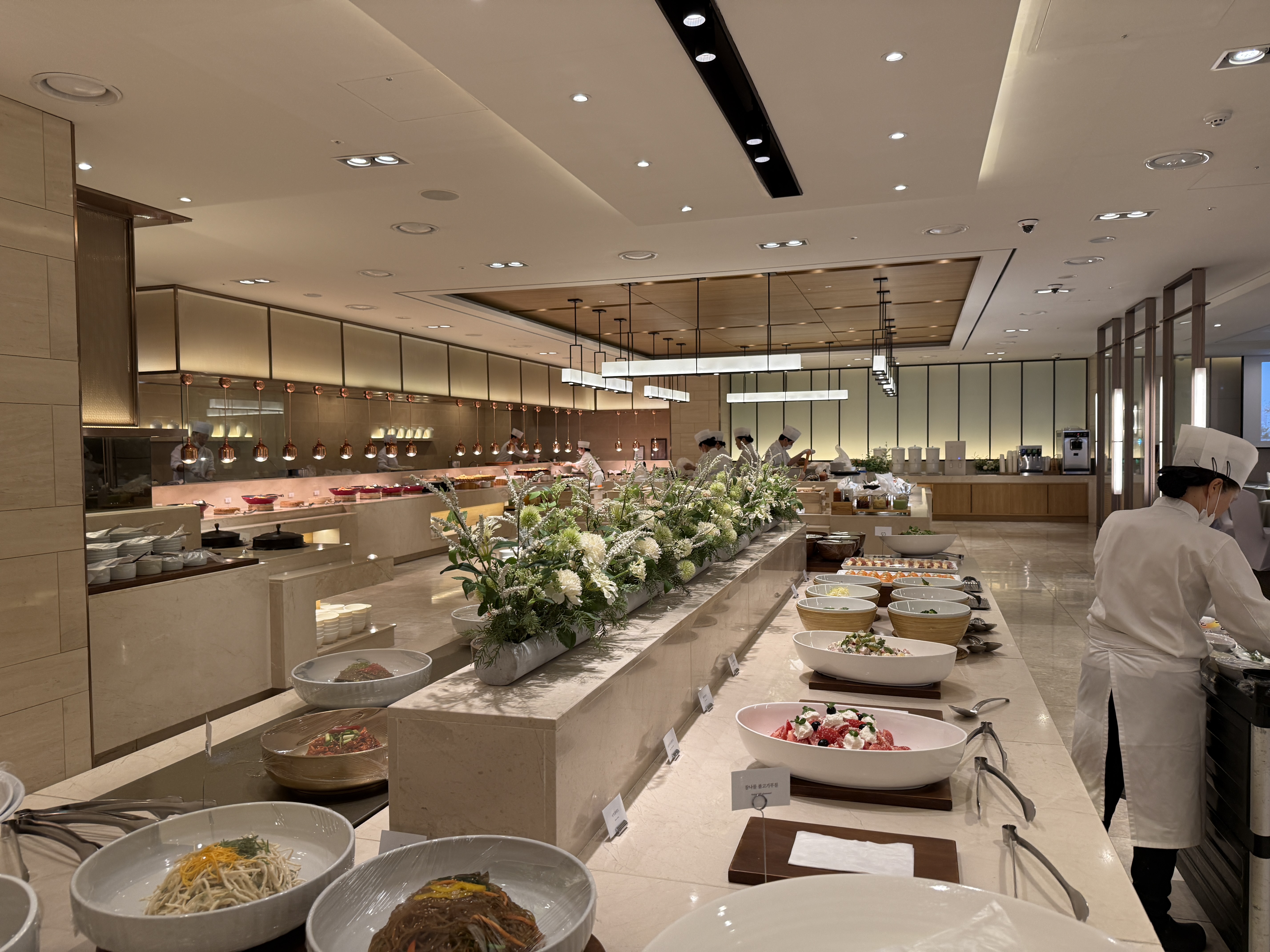 그리고 웨딩홀 후기에서 빠질 수 없는 뷔페! 아직 식은 하지 않았지만 식사 공간도 미리 살펴봤어요. 정말 깔끔하고 넓은 공간에 음식 구성도 엄청 다양하더라고요. 한식, 중식, 디저트까지 정말 정갈하게 준비되어 있었고, 실제로 '밥 때문에 여기로 계약했다'는 후기들이 괜히 많은 게 아니구나 싶었어요. 제가 간 날도 시식팀인지 요리사분들이 분주하게 음식 점검하고 계셨고, 음식 플레이팅 하나하나까지 신경 쓴 흔적이 보여서 식사 기대감이 확 올라갔습니다.