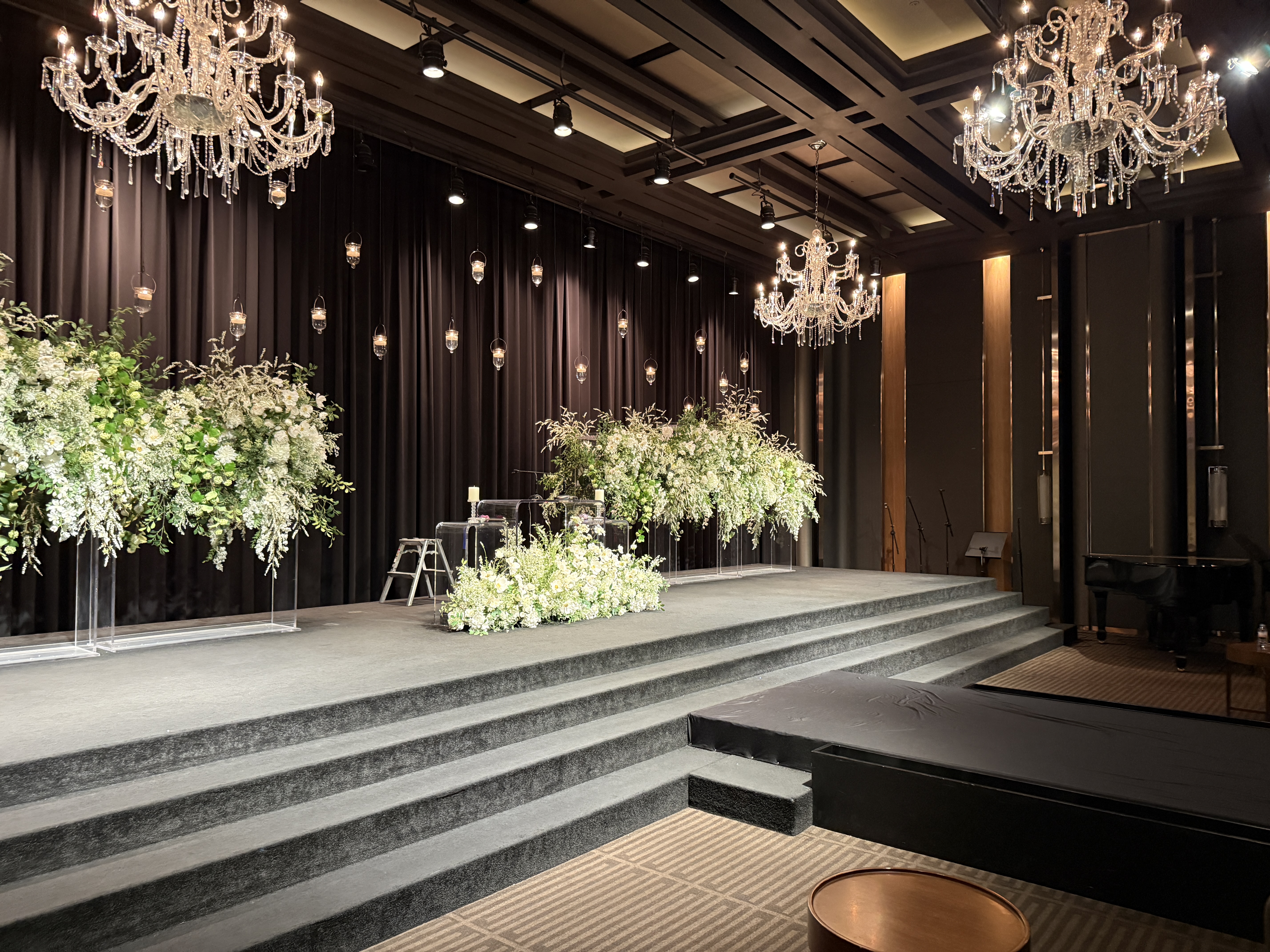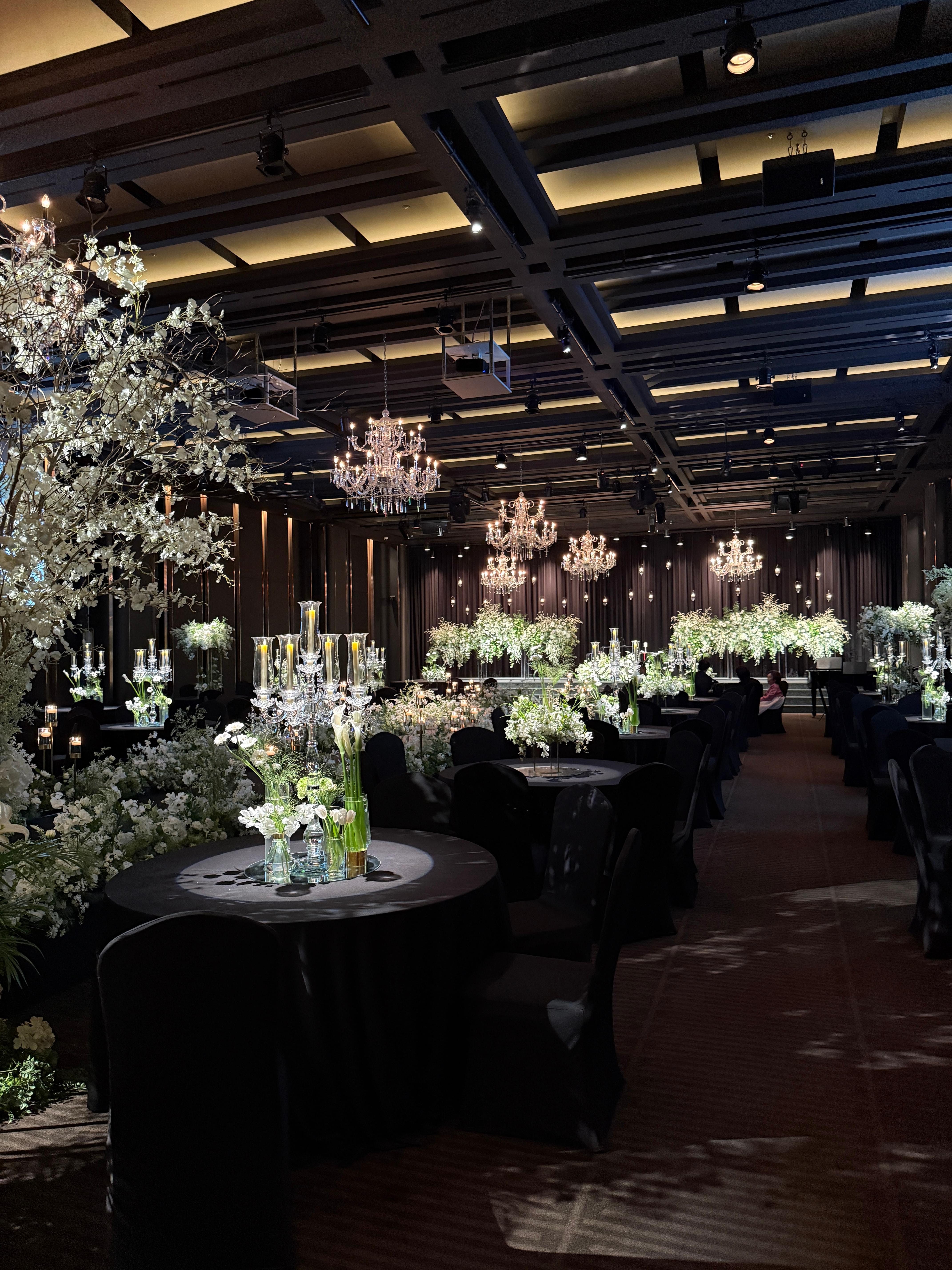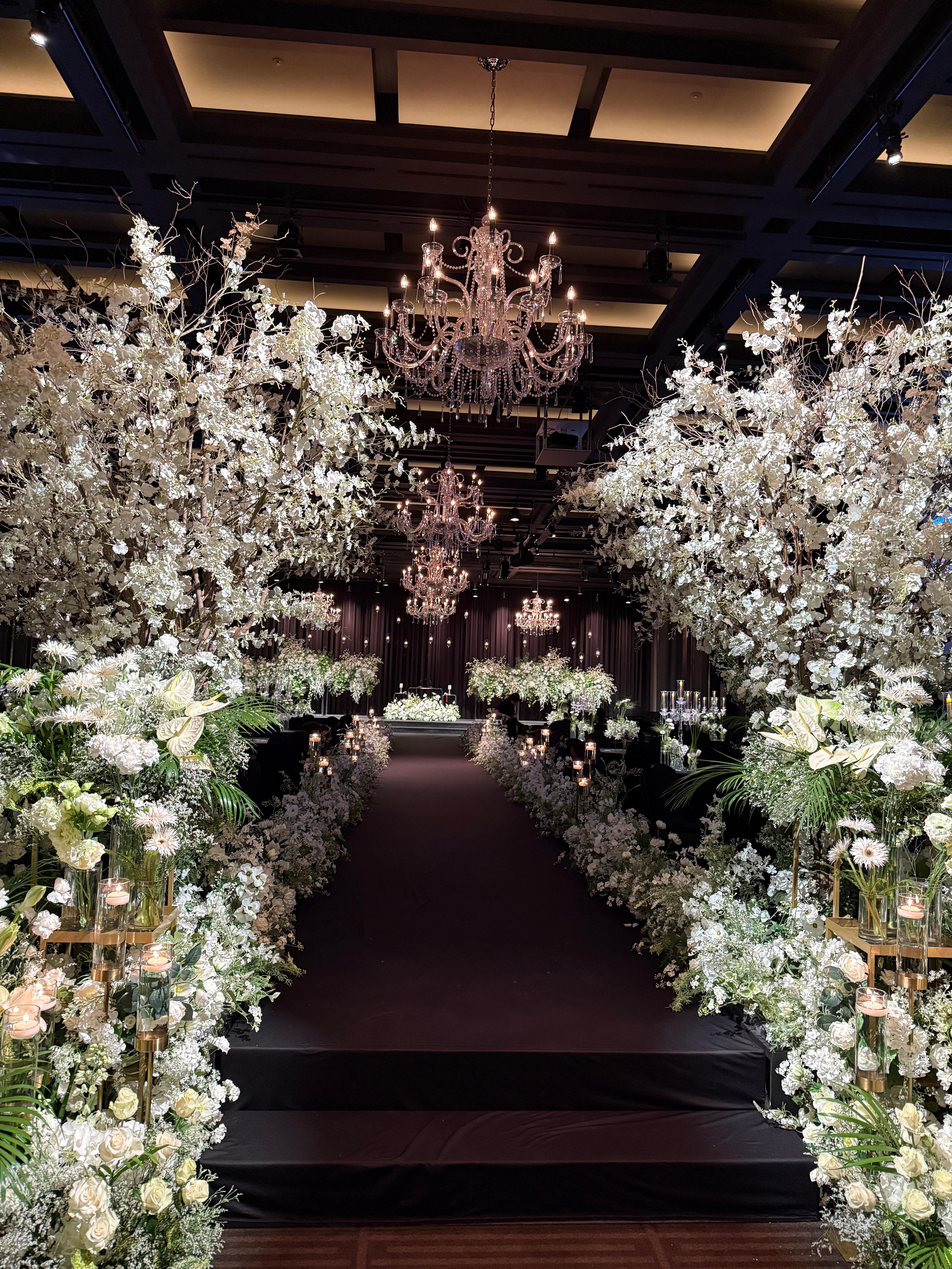 그중 저희 계약한 1층 그랜드볼룸 홀은 천장이 높고 전체적으로 넓직해서 하객들이 답답함 없이 예식을 즐기기 좋을 것 같다는 생각이 들었는데요! 조명도 은은하게 퍼지는 느낌이라 예식 분위기가 굉장히 차분하고 고급스럽게 연출되더라고요. 특히 버진로드 중앙을 따라 조화롭게 배치된 꽃장식과 샹들리에 조명이 어우러지니 웨딩화보처럼 분위기 그 자체✨