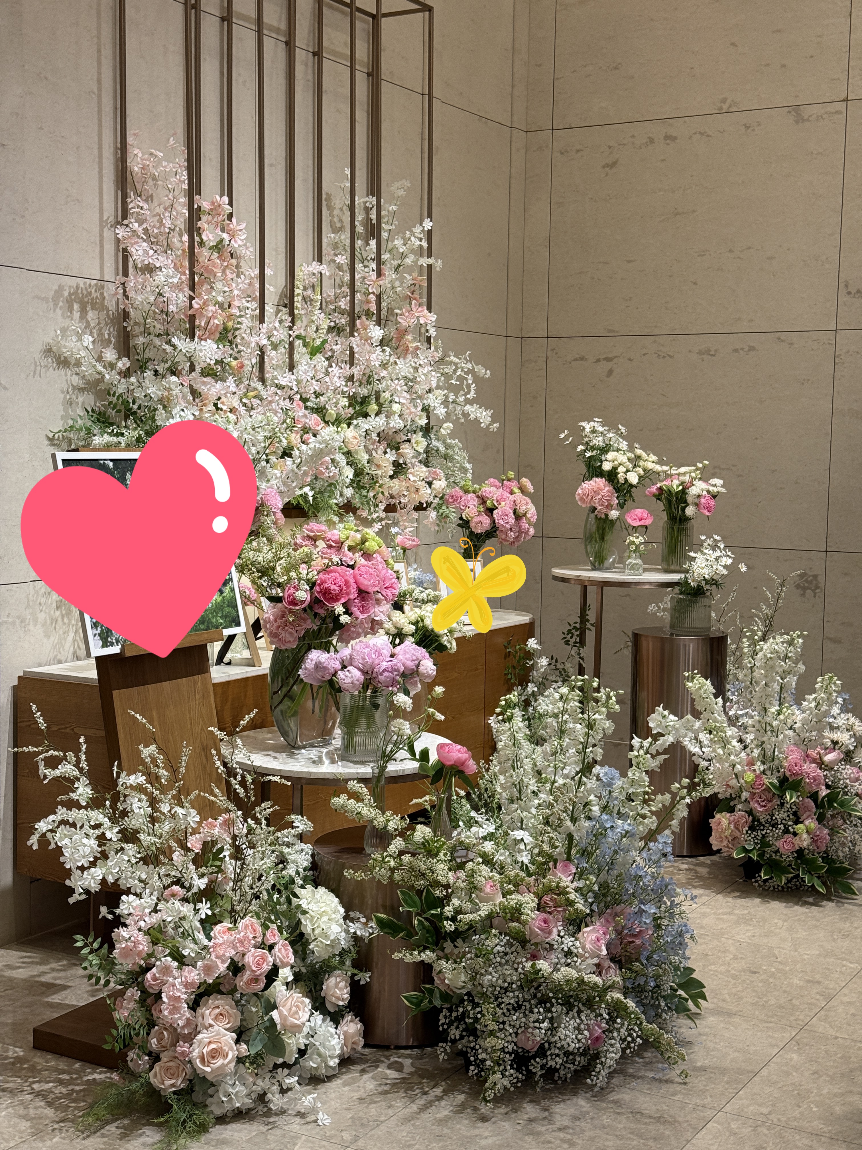 우선 로비에 들어서는 순간부터 느낌이 달라요. 널찍하고 세련된 분위기의 리셉션 데스크가 양쪽에 딱! 마치 호텔에 온 듯한 고급스러움이 느껴져서 첫인상부터 아주 만족이었어요. 꽃 포토테이블은 정말 한참 바라보게 되더라고요. 핑크, 화이트, 연보라 톤의 생화가 정성스럽게 배치되어 있어서 사진 찍기 너무 예쁘고, 같이 간 예랑이와 함께 감탄사 연발..ㅎㅎ
